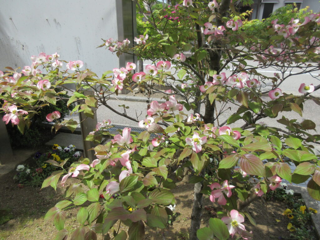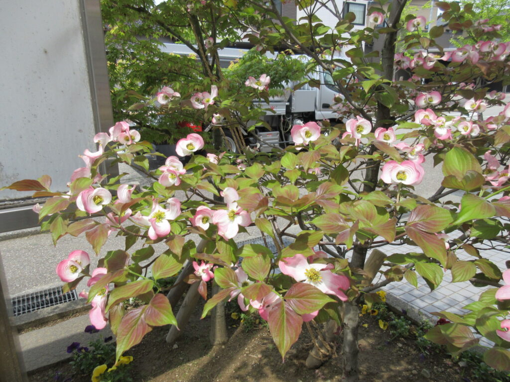 玄関前のハナミズキが満開です!