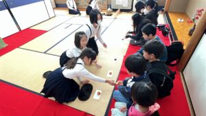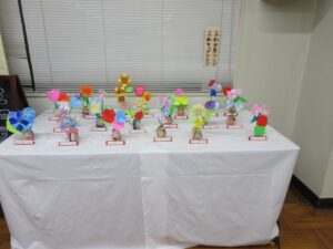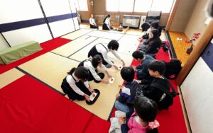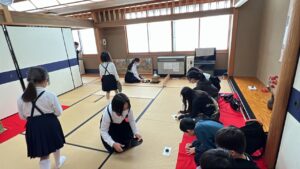 三和児童館お茶教室の皆さんによる「お茶席」です。毎年駐車場での「野点」でしたが風が強く、今年は公民館2階の和室で行いました。