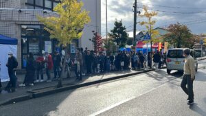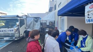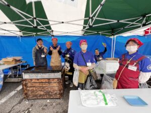 今年初めて登場したのは、やきとりの名門「秋吉」です。大きなキッチンカーがやってきて、約3時間半で3000本を焼いてくれましたが、雨の中、焼きとりを購入される方々で長蛇の列となり、お待ちいただいた方、ご近所様にもご迷惑をおかけし、大変申し訳ありませんでした。