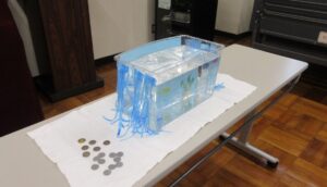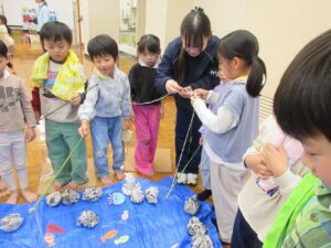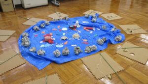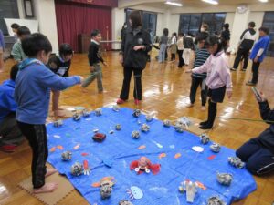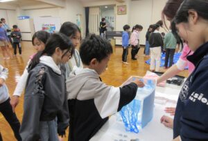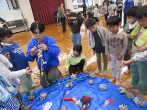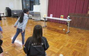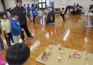 学生さんからでた反省点は「ゲームの最初にルールを説明すればよかった」「一度にたくさんの子どもたちが来て、釣りざおの糸がからまってしまった」「わなげのわっかが軽かったので、重みを付ければよかった。後輩たちにはそう伝えたい」「的あてでは、投げた後のボールをスタッフが取りにいったが、上野先生に言われて子どもたちが取りに行き、なるほどと思った」「コイン落としは、子どもたちには手を水につけないようにと言ったが、結局は水浸しになったので、最初からタオルを用意すれば良かった」
