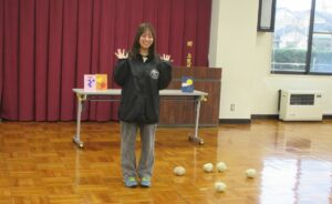 また、上野館長からは「いつもなら、わなげは一人3個ほどだが10個も投げられて楽しかったよう」「的あては、上からボールを投げられない子もいるので、投げ方の指導もあれば良かった」「距離ももう少し長くてもよかった。スタッフがボールを取りに行ったら、身体がもたない。ボールを取りに行くのもゲームのうち」というお話しがありました。学生さんたちの参考になりましたね!