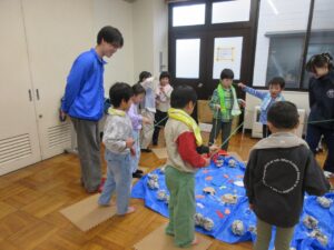この日の参加者は67人でした。最後に、おにいさん、おねえさんにお礼を言いました。とっても楽しかったです。終わってから、三和児童館の上野館長と学生さんたちの反省会が行われました。