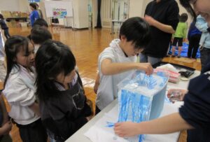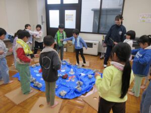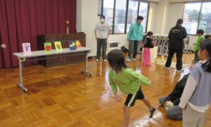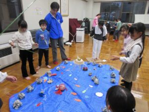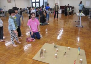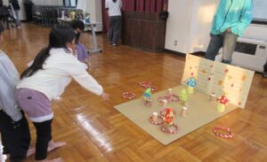 学生さんからでた反省点は「ゲームの最初にルールを説明すればよかった」「一度にたくさんの子どもたちが来て、釣りざおの糸がからまってしまった」「わなげのわっかが軽かったので、重みを付ければよかった。後輩たちにはそう伝えたい」「的あてでは、投げた後のボールをスタッフが取りにいったが、上野先生に言われて子どもたちが取りに行き、なるほどと思った」「コイン落としは、子どもたちには手を水につけないようにと言ったが、結局は水浸しになったので、最初からタオルを用意すれば良かった」