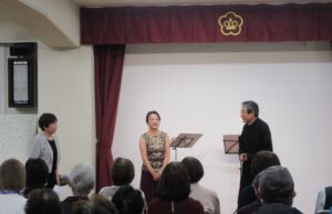 令和7年11月5日(水)高齢者学級・SDGs学級合同企画「篠笛とソプラノとピアノのジョイントコンサート」が開催されました。出演は、篠笛/八木 粋久先生・ソプラノ/奥 京子先生・ピアノ/西村 礼子先生です。篠笛の八木 先生とソプラノの奥先生はご夫婦で、ピアノの西村先生と八木先生は小・中・高校の同級生ということで、息もピッタリです。