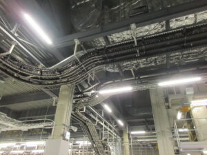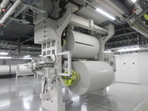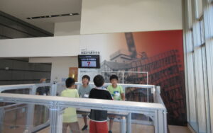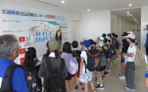 お昼ご飯のあとは、まず「北國新聞白山印刷センター」へ見学にいきました。国内最高の印刷技術を見学できる施設だそうです。子どもたちは最初、「なんかニオイがする」と言っていましたが、間近でみるAI搭載の最新輪転機が高速で紙面を刷り上げる様子や、でき上がった新聞がベルトコンベヤーで運ばれていく様子、無人ロボットが巨大なロール状の新聞用紙を自動で搬送する光景などに驚いていました。めったに見ることのできない設備が見学できたのは、子ども大人もとても良かったです。