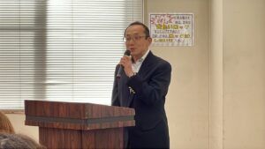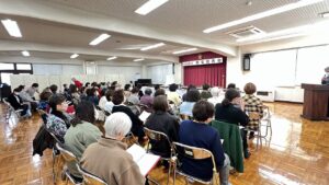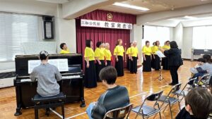 ⑨能登半島地震から2年以上経ちましたが、少しずつ復興が進んではいるようですが、一日でも早く穏やかな日々が戻ってきますよう願いを込めて、会場の皆さまと女性コーラス三和・音夢の会・三和児童館のみなさんとでご一緒に「ふるさと」を歌いました。