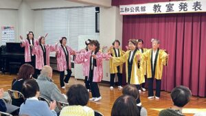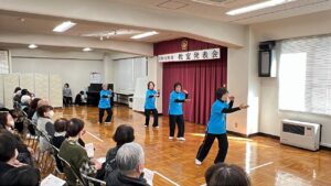 寿会体操教室の皆さま、どうもありがとうございました。本当に春が待ち遠しくなる曲でした。お揃いのきらびやかな法被で、隊形変換もばっちりでした!約40年前に開設された「寿会体操教室」。今後も、ますますお元気で、50年100年と続くことを願っております。