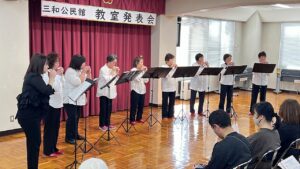 三和公民館1階ホールで、月2回季節に合った歌を歌っています。笑いの絶えないグループで、指導者自身が皆さんからパワーをもらい楽しませていただいております。3曲目の「さびしいカシの木」はアンパンマンのやなせたかしさん作詞の曲です。おだやかなメロディーにのせた詩が優しい気持ちにさせてくれます。今日は、「おかあさん」「白い想い出」「さびしいカシの木」です。